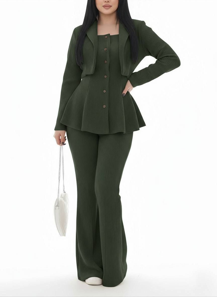 ست سه تیکه شیک پاییزی شامل کت کوتاه،جلیقه دکمه دار و شلوار راسته دمپا گشاد جنس کبریتی پیچکی بسیار شیک و خاص