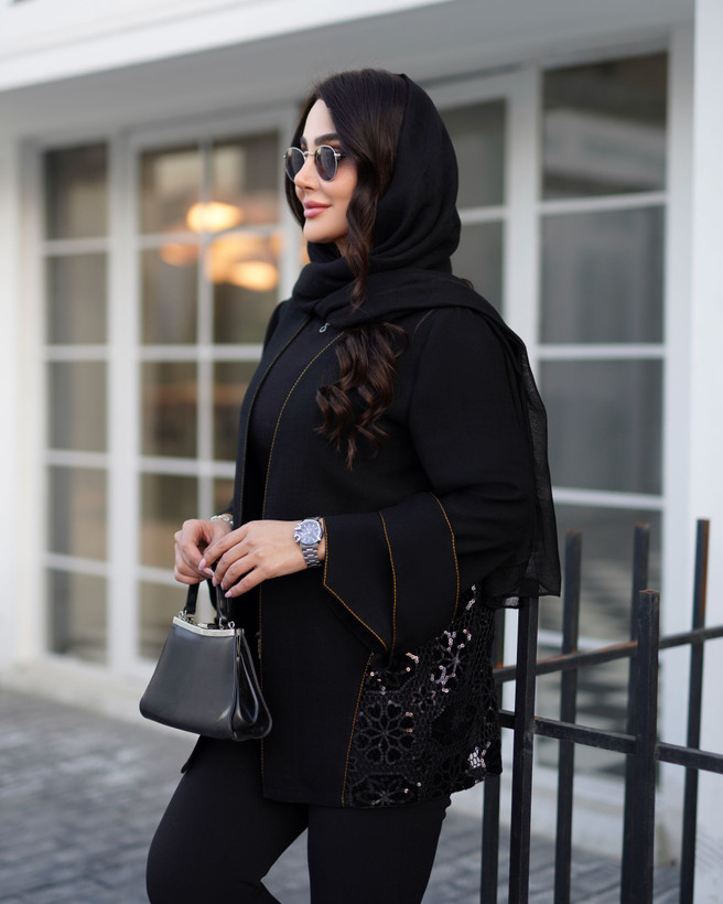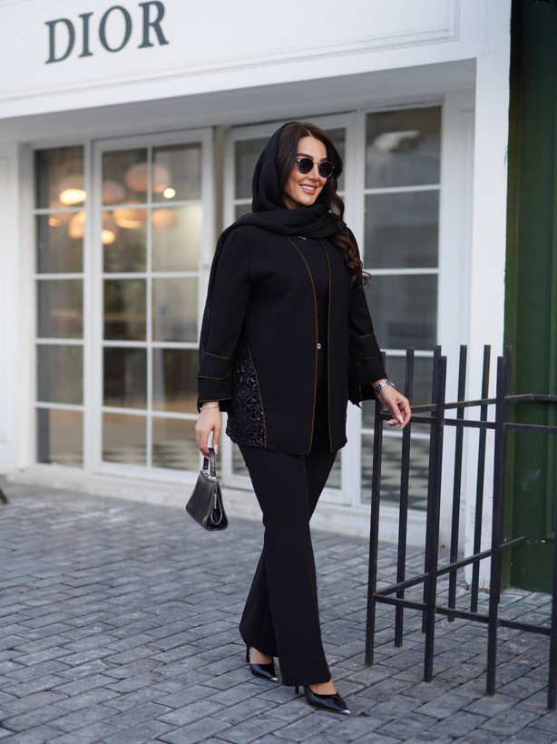 جزئیات: پشت کار چاکدار جلوی کار لایی پرشین کار شده جهت ایستایی بهتر 🎨 تک رنگ طبق ژورنال (مشکی با دو رنگ دوخت طلایی و سفید) 📏 قد تا پایین کار 70 قد آستین از سرشانه تا مچ 52 اندازه چاک 11 سانت