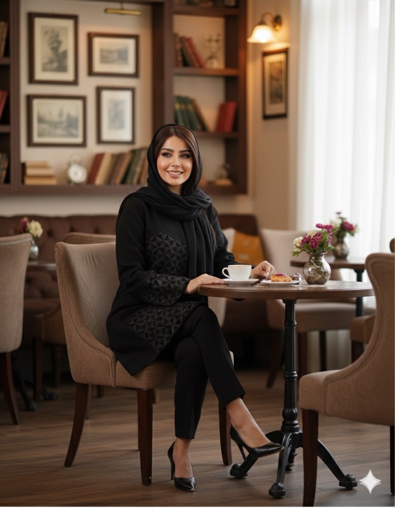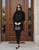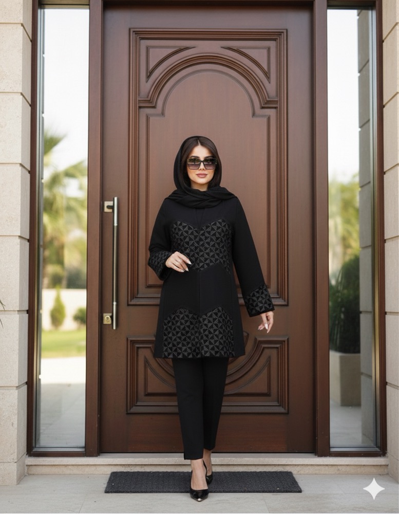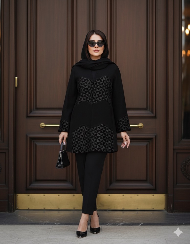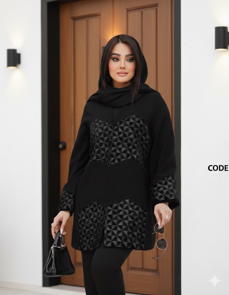 جزئیات: جزئیات طراحی: پنلهای مخمل سوزندوزی شده به صورت متقارن در جلو و لبه آستینها؛ مجهز به قزن مخفی (قابلیت استفاده به صورت جلو باز و بسته)